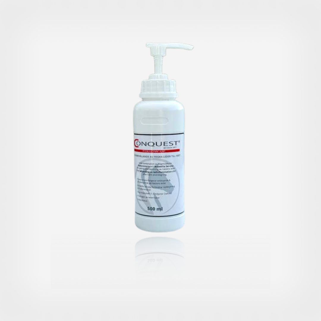 För att öka givan av hyaluronsyra rekommenderar vi att ge Conquest Every Day. Det är ett flytande tillskott som kan ges i kombination med både ChondroBas, ChondroPlus, Conquest Follow Up och HyaHydraBoost.